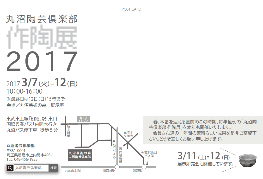 2017年 3/7(火)〜3/12(日) 10:00〜16:00 ※最終日は12日(日) 15時まで 会場:丸沼芸術の森 展示室 3/11(土)・12(日) 展示即売会も開催しています