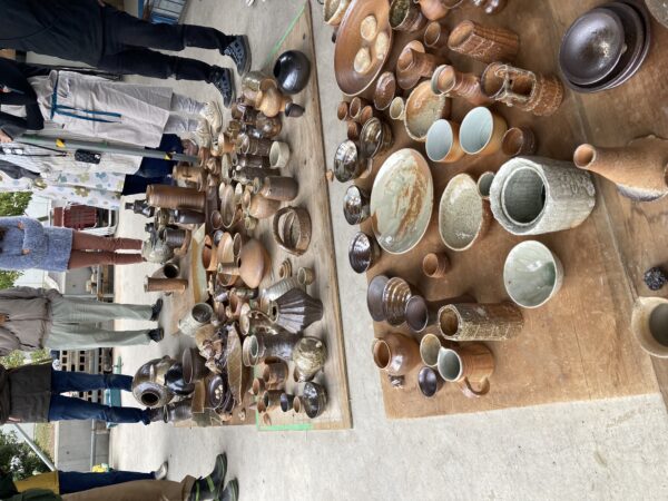 まず、窯の横穴から細く割った薪を投げ入れる脇差しも十分にでき、窯の後方までしっかり昇温できました。薪を焚べる正面の焚き口近辺の作品もしっかり灰がかかってました。