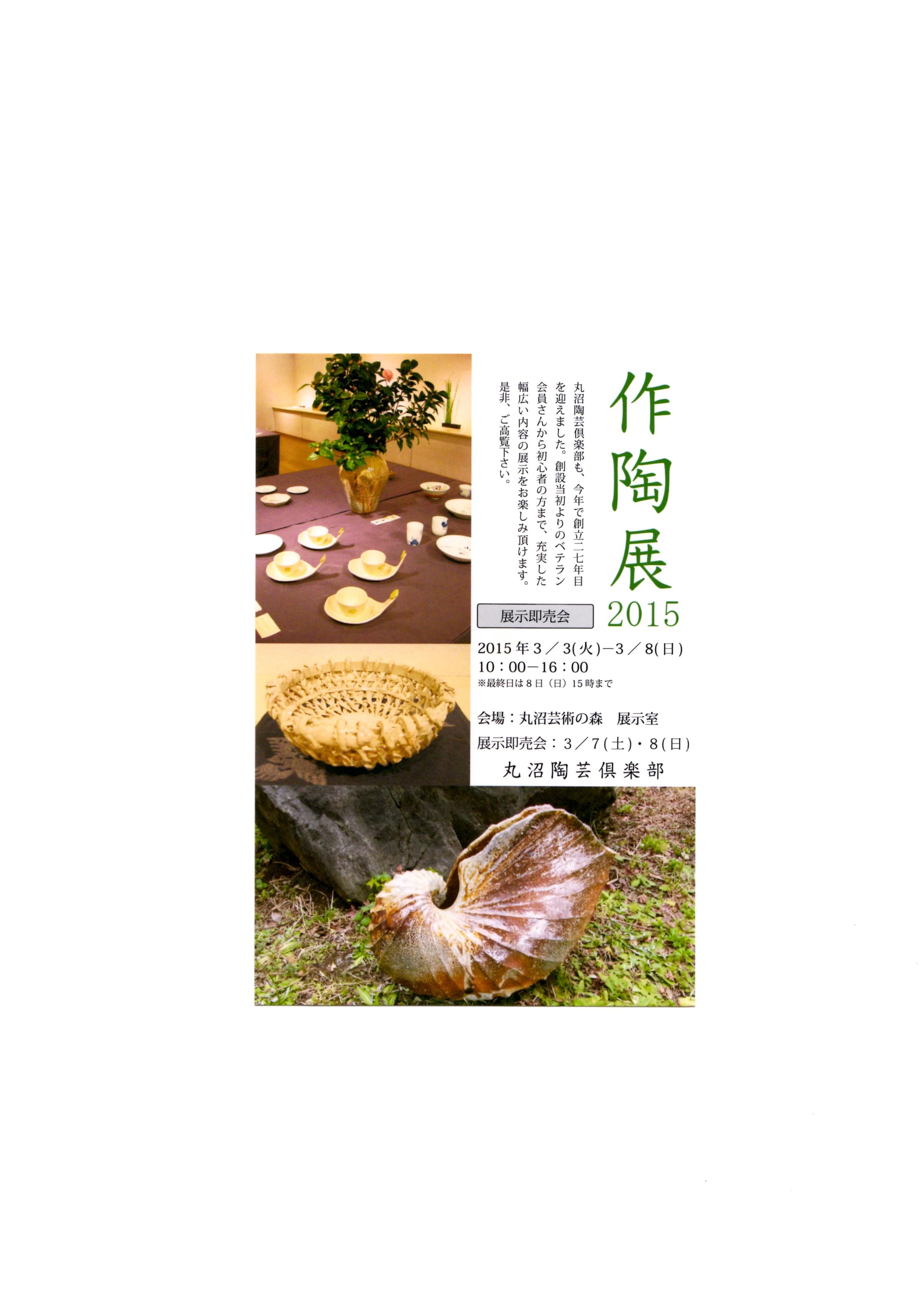 丸沼陶芸倶楽部も、今年で創立二七年目を迎えました。 創設当初よりのベテラン会員さんから初心者の方まで、充実した幅広い内容の展示をお楽しみ頂けます。 是非、ご高覧ください。 会場;丸沼芸術の森 展示室 日時;3月3日(火)〜 3月8日(日)10:00〜16:00 ※最終日は15:00まで 丸沼陶芸倶楽部前にて、展示即売会を開催します。是非、お立ち寄りくださいませ。